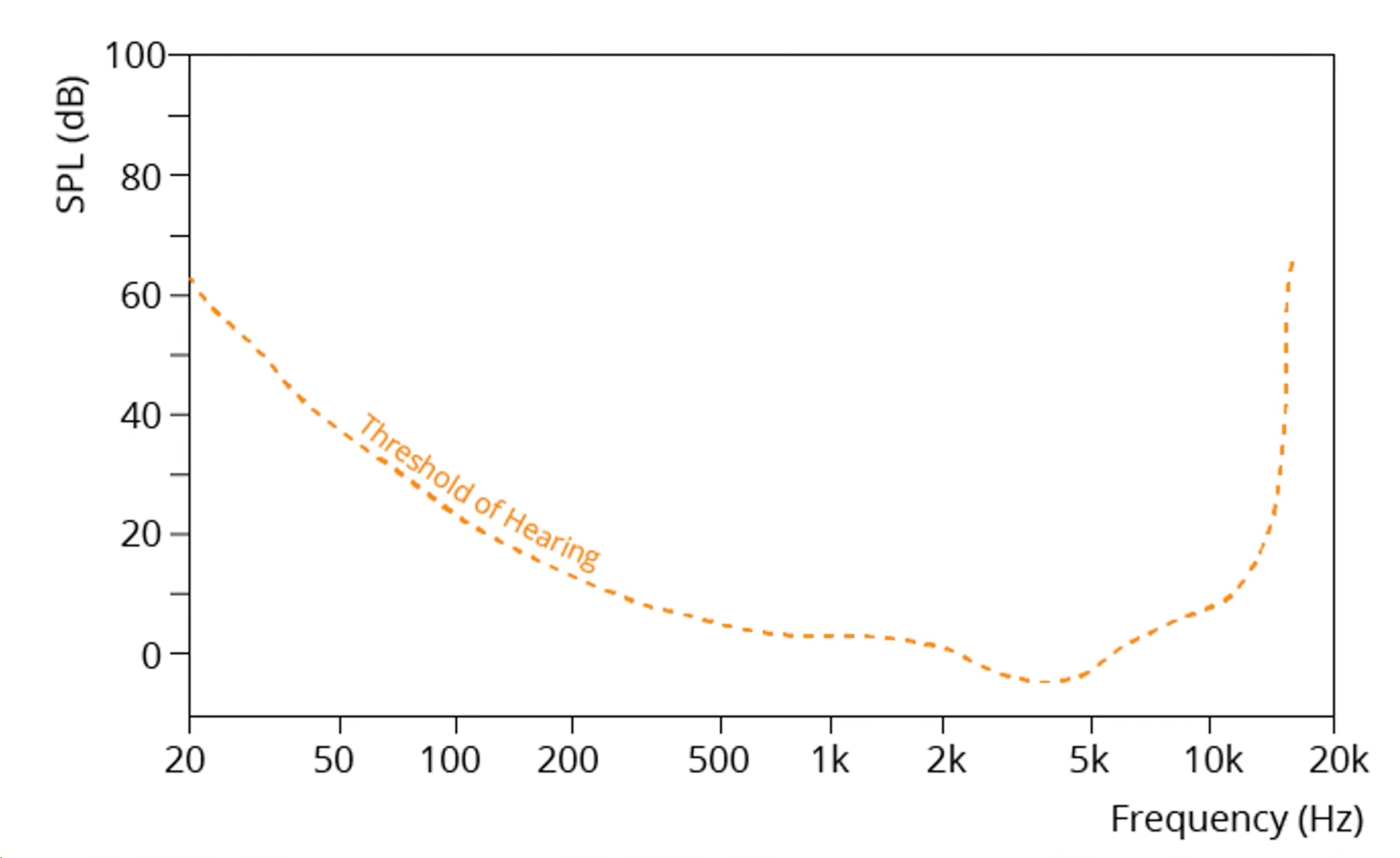 The dashed line represents the threshold between what is audible and what is not to the human ear. In order for the sound at a particular frequency to be perceivable, the SPL must be above the line.