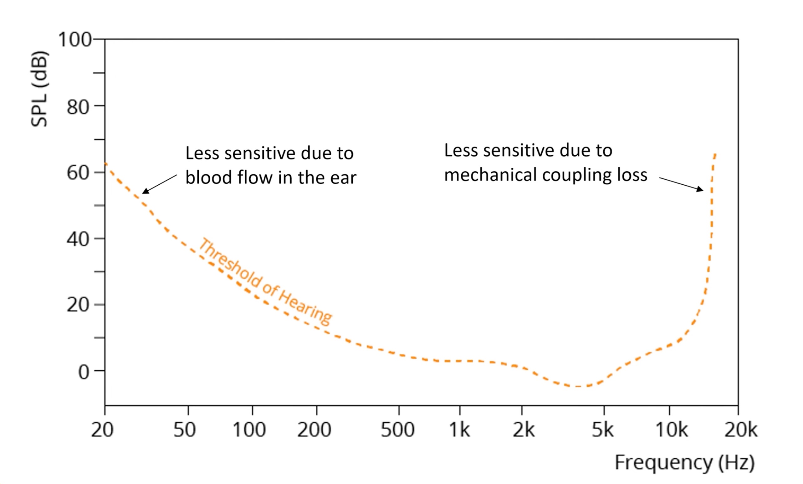 Toward the extremes of the audible frequency spectrum, the SPL required for sound to be perceived increases due to limitations in the human auditory system.